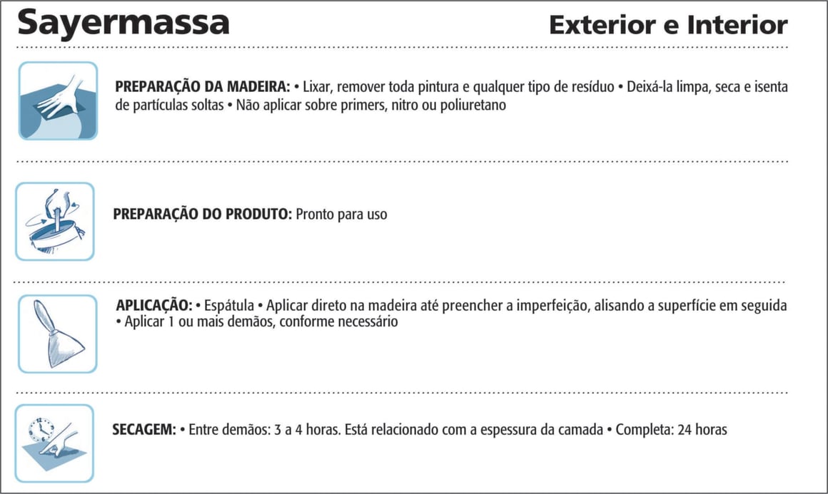 | Preparação Madeira | A madeira deve estar seca, limpa e isenta de pó. Aplique a Sayermassa com a cor próxima da madeira, aguarde tempo de secagem e promova o lixamento com lixas apropriadas, seguindo sempre os veios da madeira. Pode-se iniciar com uma lixa grana 180 depois 240 podendo chegar a grana 280 para deixar a superfície mais lisa, em seguida remova com ar ou com um pano seco resíduos e o pó do lixamento. |
