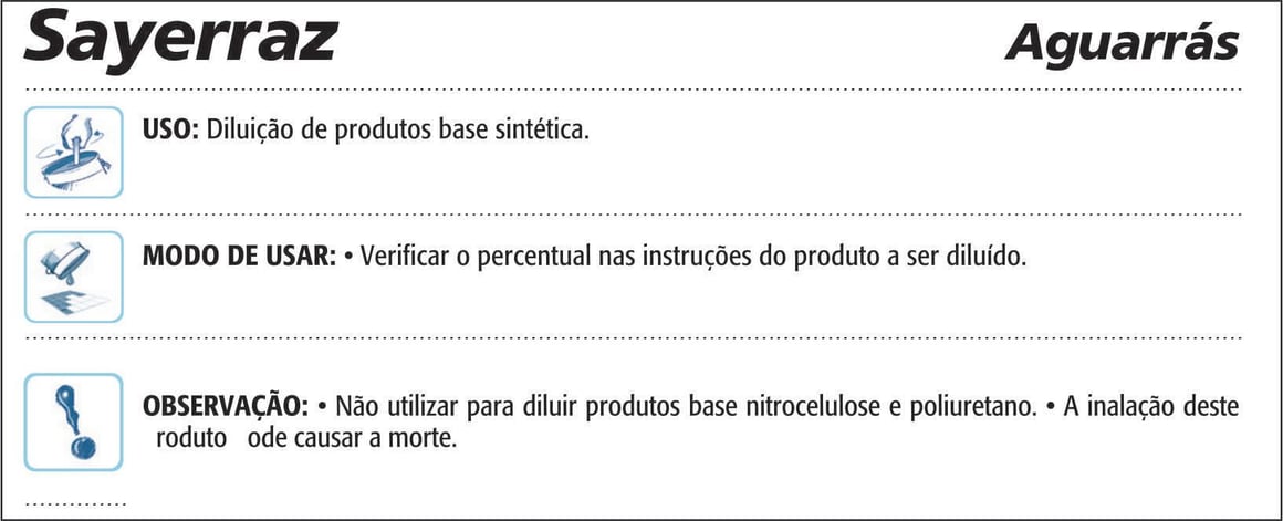 O Solvente Aguarrás Sayerraz é um produto nacional, pronto para uso, e indicado para diluição de produtos sintéticos. Ele auxilia tanto na aplicação como na secagem, garantindo um resultado impecável. Para garantir a segurança durante o manuseio e aplicação, utilize equipamentos de proteção adequados, como óculos, máscaras e luvas. O produto deve ser armazenado em local coberto, à sombra, seco e ventilado, com a embalagem fechada e sem danos.