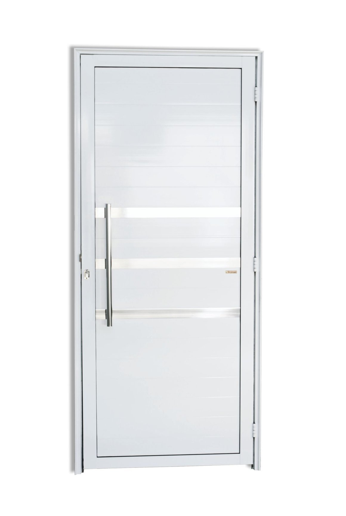 A Porta Lambri e Friso Alumínio Branco Esquerda 210x100x4,6cm Super 25 da Brimak é uma porta de giro, com abertura para a esquerda, e inclui batente, puxador, fechadura e dobradiças. Fabricada no Brasil, ela possui garantia de 60 meses e é ideal para uso em salas e fachadas. Com medidas de 210cm de altura, 100cm de largura e 4,6cm de profundidade, a porta pesa 17,01kg e oferece um design moderno e elegante, com frisos que garantem um visual clean e sofisticado.